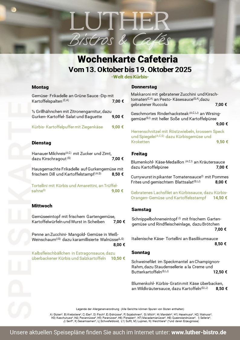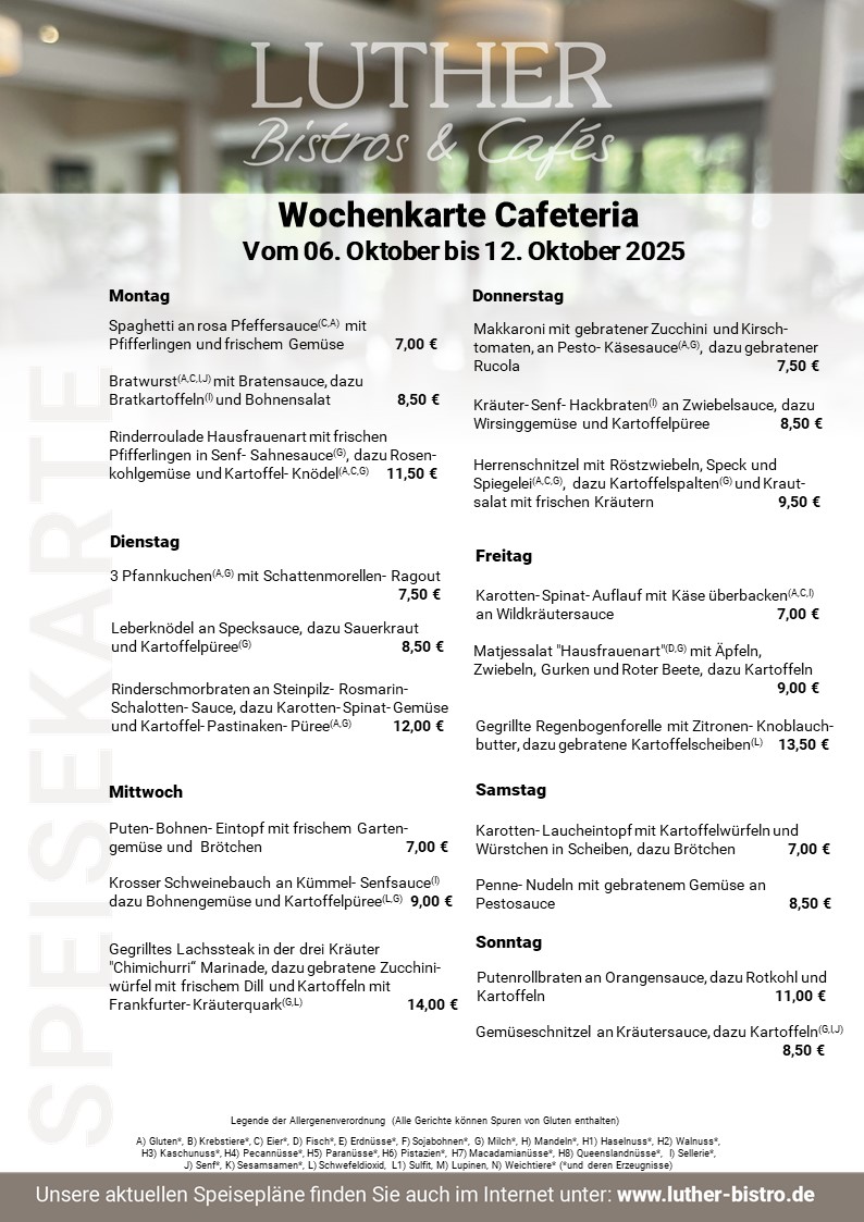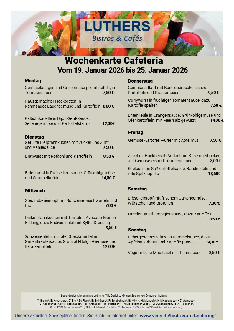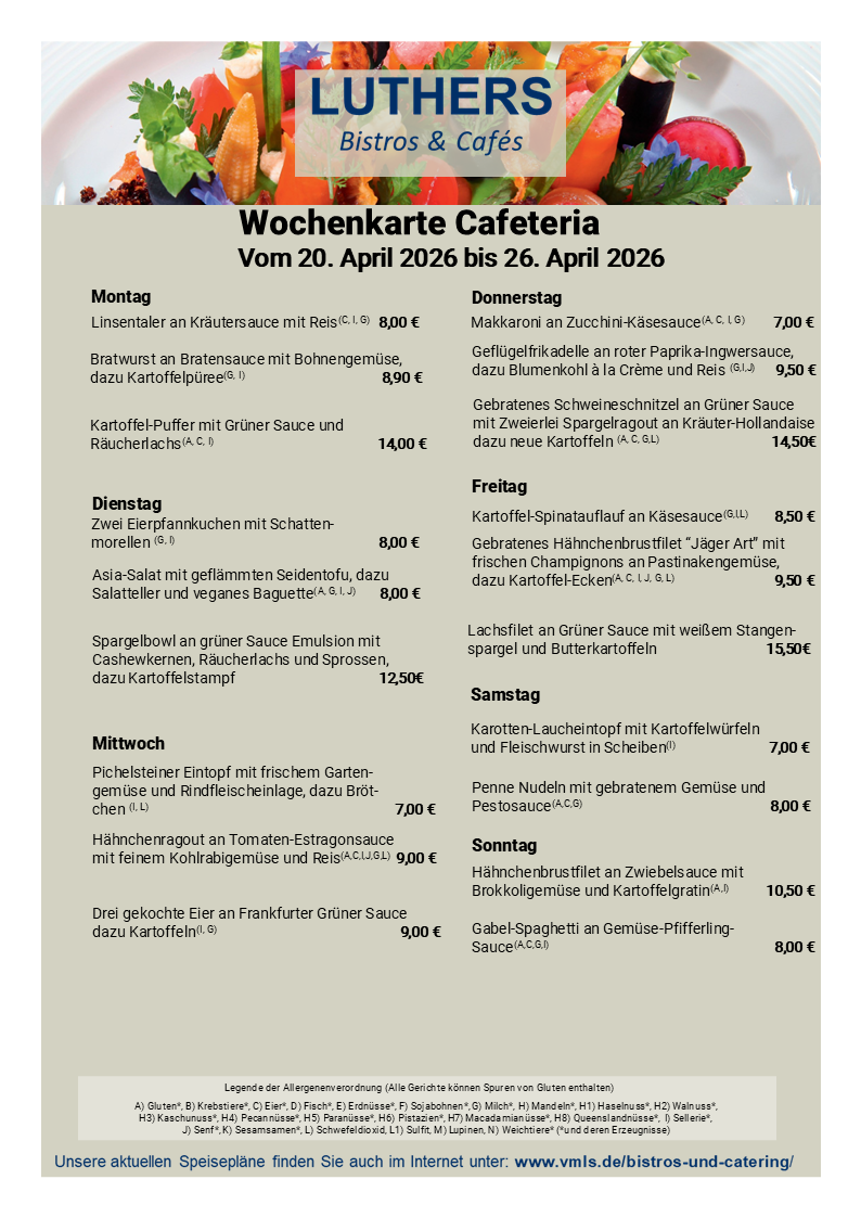 Im Luther Bistro Auf der Aue bieten wir bieten täglich wechselnd drei frisch zubereitete Speisen an. Eins der drei Essen ist dabei immer vegetarisch.