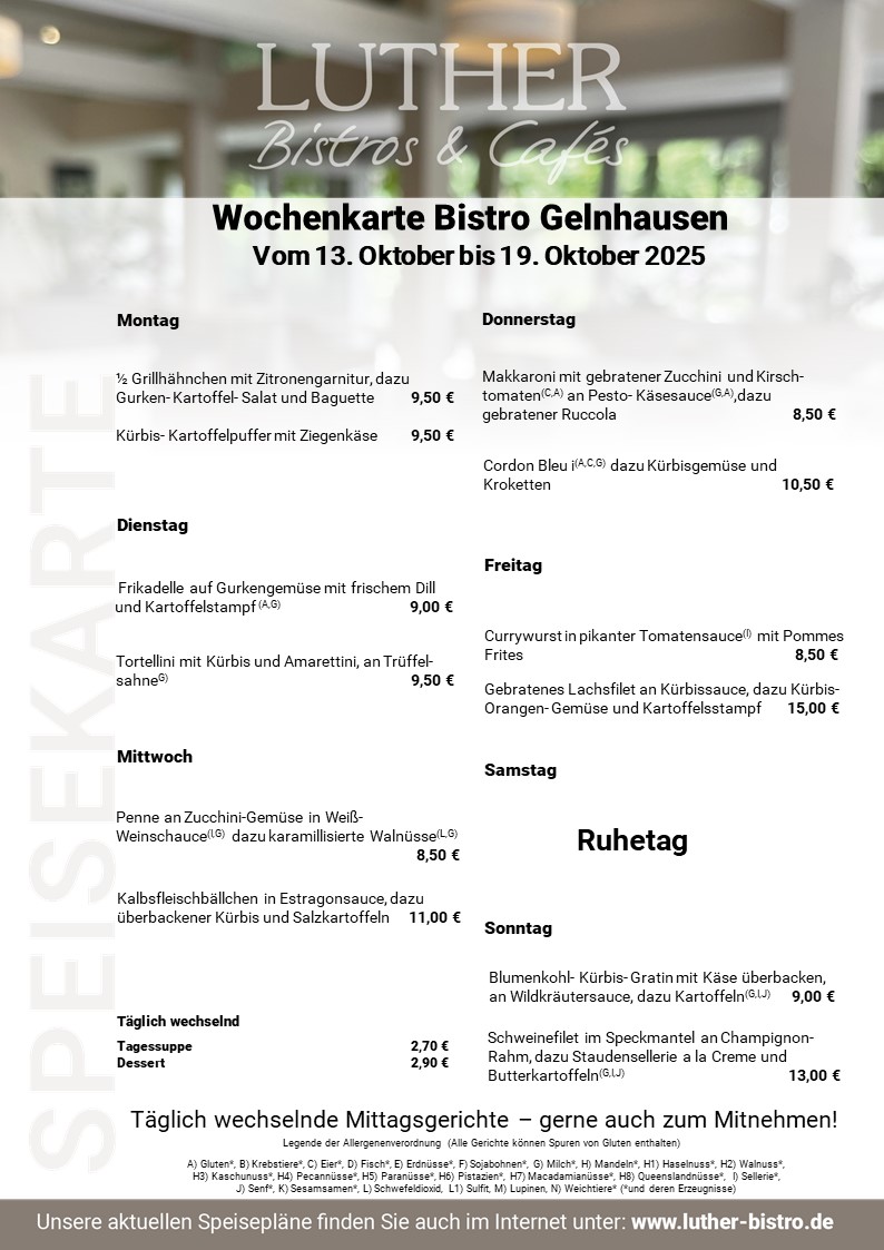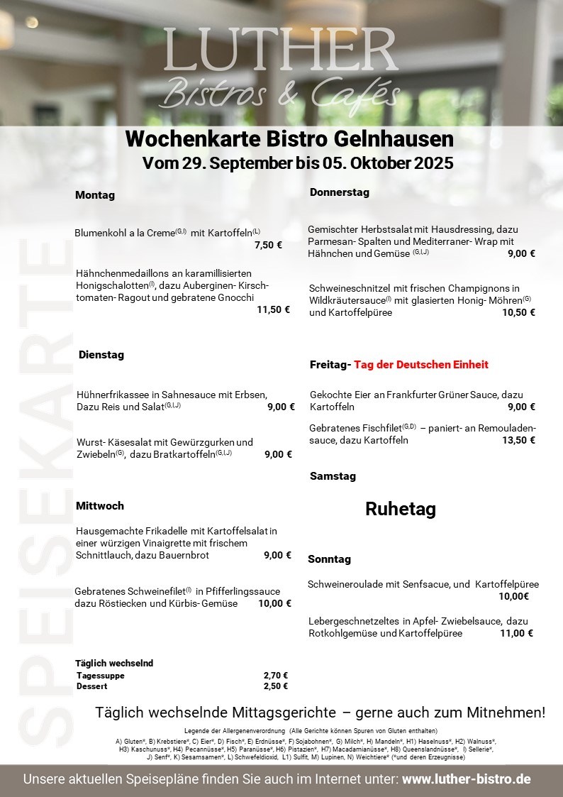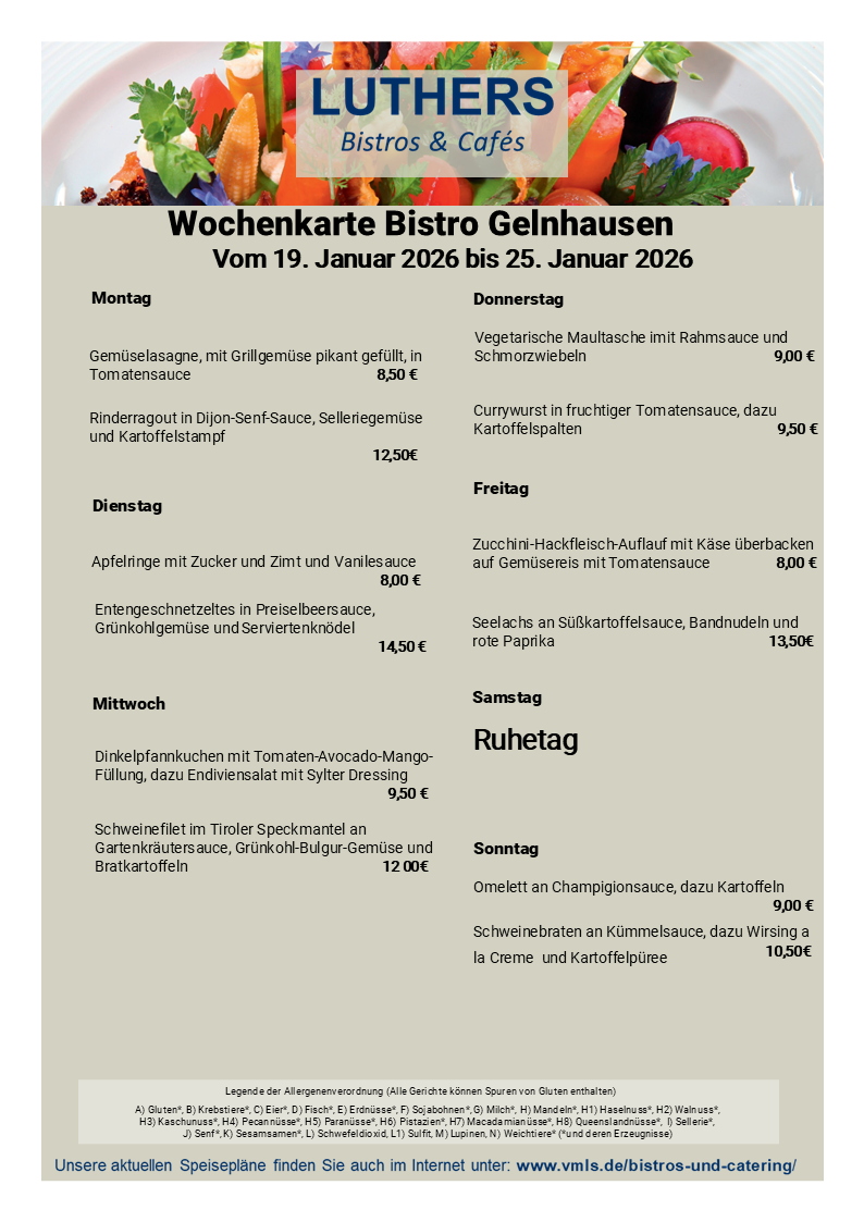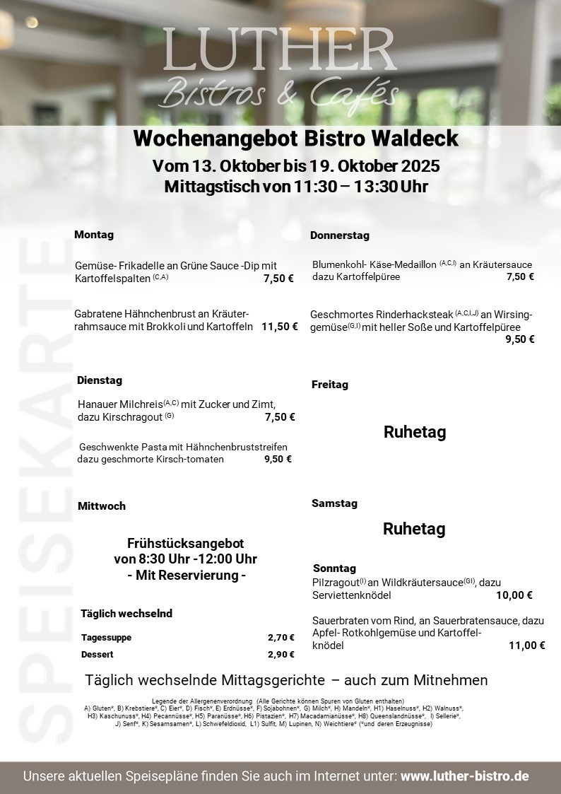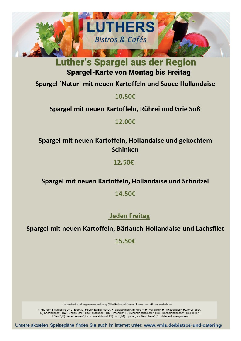 Im Luther Bistro Auf der Aue bieten wir bieten täglich wechselnd drei frisch zubereitete Speisen an. Eins der drei Essen ist dabei immer vegetarisch.