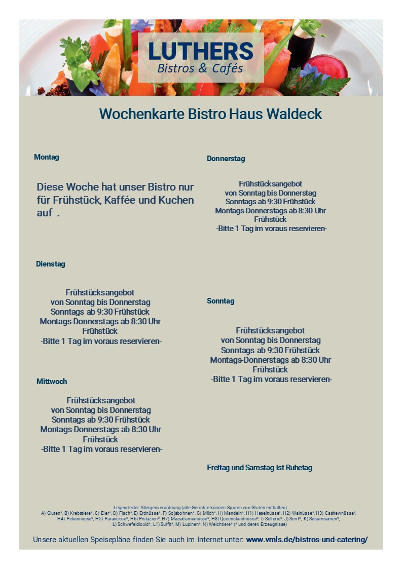 Das 2016 eröffnete Pflege- und Beratungszentrum Haus Waldeck befindet sich am Rande des Kurparks voon Bad Salzschlirf. Im großzügig gestalteten, modernen Bistro finden rund 50 Gäste Platz. Zum Bistro gehört auch eine schöne Terrasse: Hier können die Gäste in der warmen Jahreszeit ihren Aufenthalt genießen.Jeden Dienstag werden Waffeln für Sie gebacken. Aber auch an den anderen Tagen lohnt sich der Besuch zur Kaffeezeit: Es erwartet Sie hausgemachter Kuchen.