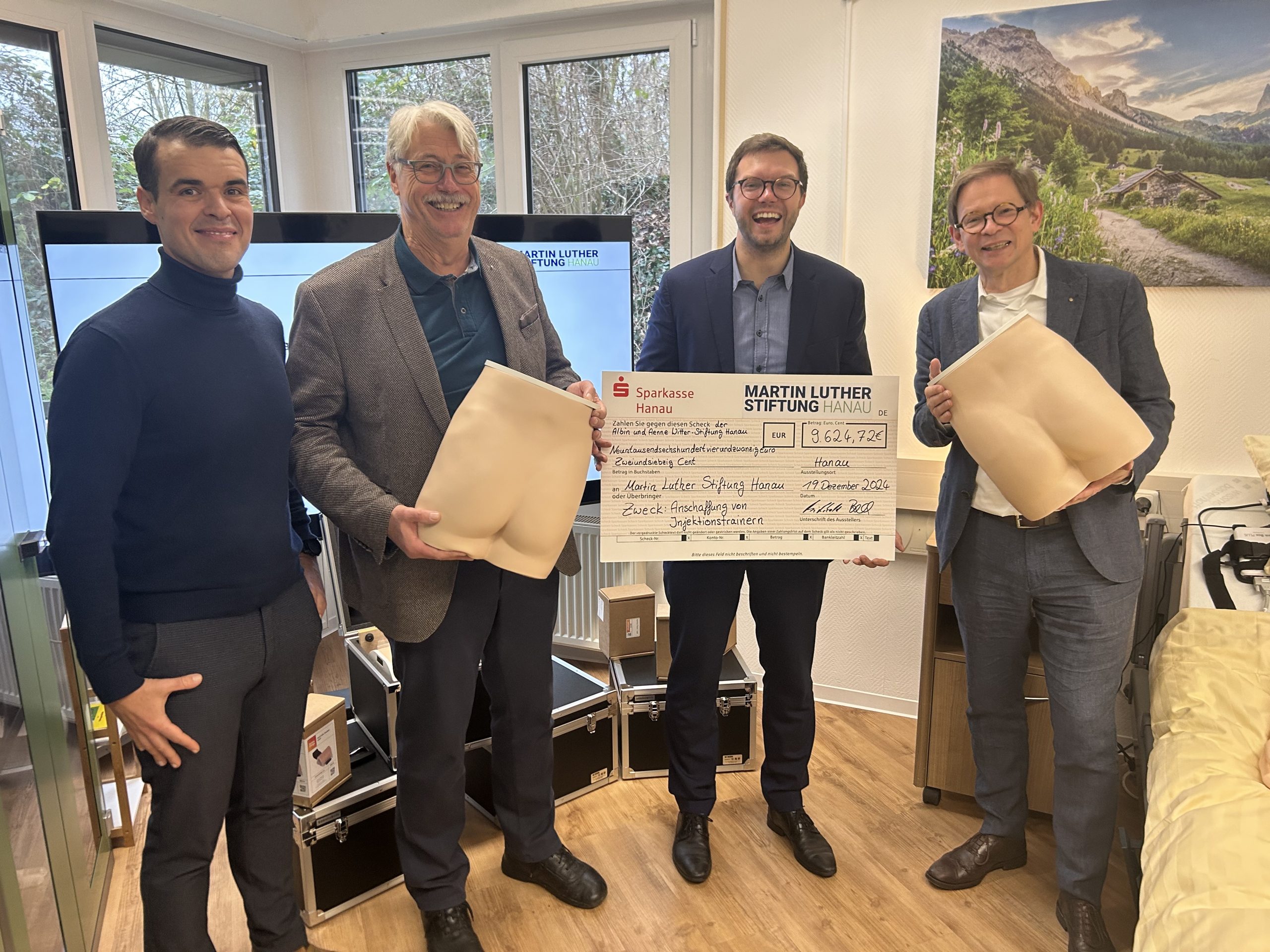 9000 Euro stellte die Stiftung für hochwertigen Geräte zur Verfügung. Überreicht wurde der Scheck von den Vorstandsmitgliedern Dr. Norbert Reichhold und Prof. Dr. Stefan Buchholz. Mit dabei auch Hanaus Bürgermeister Dr. Maximilian Bieri, der einen Sitz im Kuratorium der Stiftung hat. Sascha Lippert, Leitung der Zentralen Praktischen Ausbildung in der MLS, erklärte bei der Übergabe: „Die Ausbildung im Gesundheits- und Pflegebereich erfordert eine hohe Praxisorientierung. Ein zentrales Element dieser Ausbildung ist die sichere Durchführung von Injektionen. Die Injektionstrainer bieten den Schüler*innen die Möglichkeit, unter realistischen Bedingungen zu üben. Danach wenden sie das in der Praxis an.“